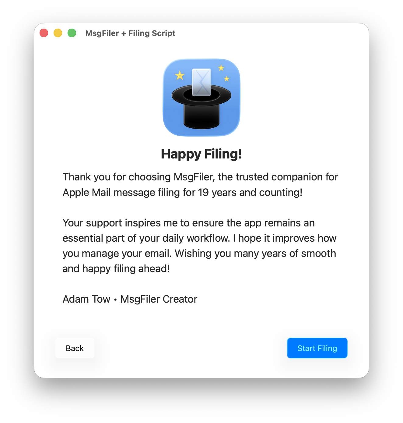 Congratulations! You've made it through the onboarding process! Click **Start Filing** to exit the onboading screensand to open the MsgFiler 4 main window.