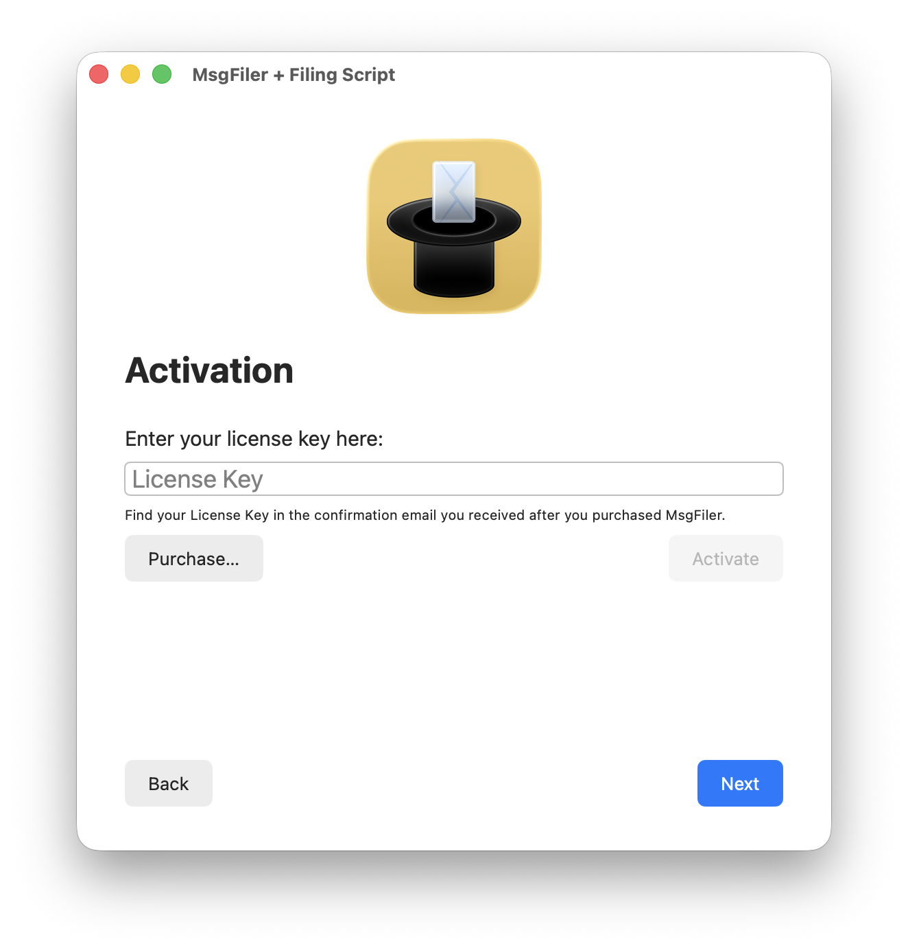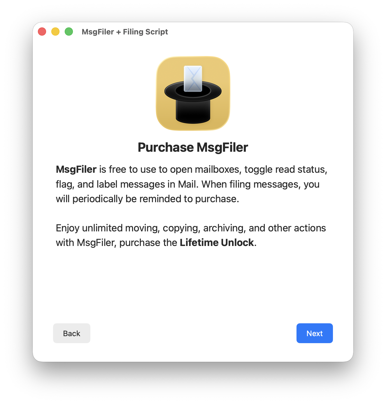 Lifetime Unlock licenses for MsgFiler 4 are available for purchase on Gumroad. If you do not wish to purchase MsgFiler 4 at this time, click **Next** in the two screens below.