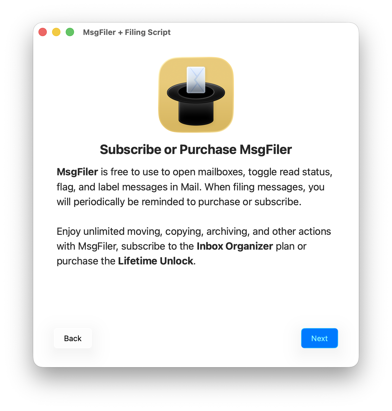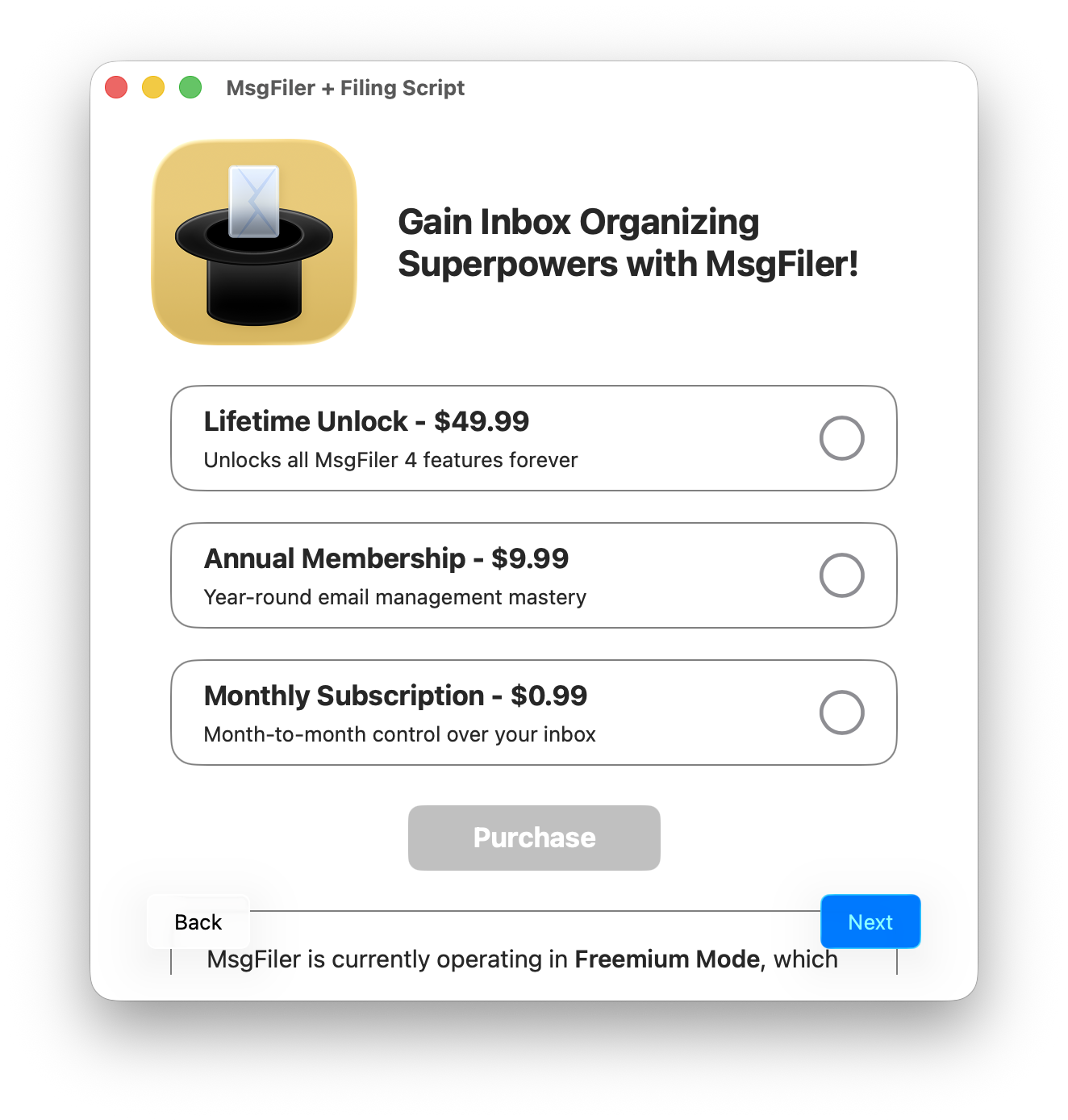If you downloaded MsgFiler 4 from the Mac App Store, you will be presented with options to purchase a  **Lifetime Unlock** or to subscribe to one of the **Inbox Organization** subscription plans when you click the **Next** button.
