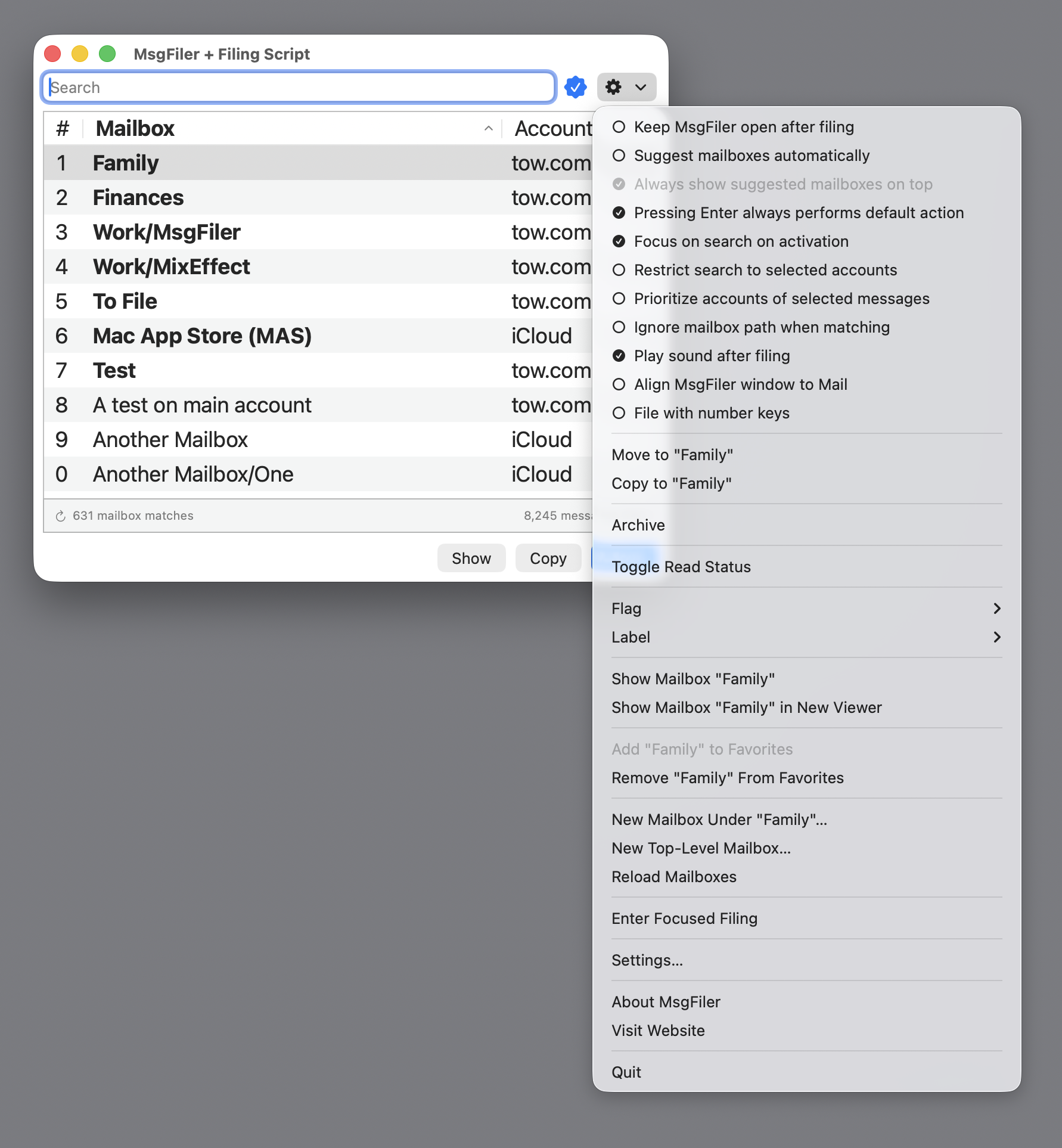 Moving and copying messages that belong to Gmail accounts requires the installation and activation of the MsgFiler Filing Script. Archiving and toggling the read status or flag of selected messages, regardless of account, also requires the MsgFiler Filing Script.